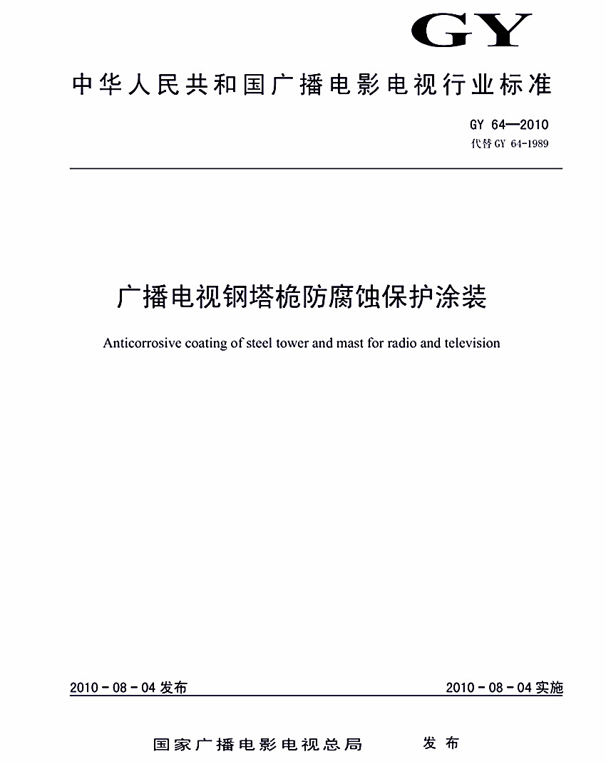 GY 中華人民共和國廣播電影電視行業標準 GY 64-2010 代替 GY 64-1989 廣播電視鋼塔桅防腐蝕保護涂裝Anticorrosive coating of steel tower and mast for radio and television 2010-08-04發布 2010-08-04實施 國家廣播電影電視總局發布 本標準規定了廣播電視鋼塔桅防腐蝕保護涂裝的技術要求、檢驗要