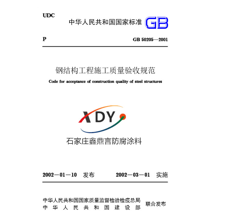 本文介紹了GB50205-2001鋼結構工程施工質量驗收規范對于鋼結構防腐涂料涂裝的表面處理要求,各類防銹漆、底漆對應的最低除銹等級及防腐涂料的涂層厚度、驗收標準。專業的XDY鋼結構防腐漆生產廠家為您提供質量優異,價格合理的XDY鋼結構防腐涂料全系列產品。