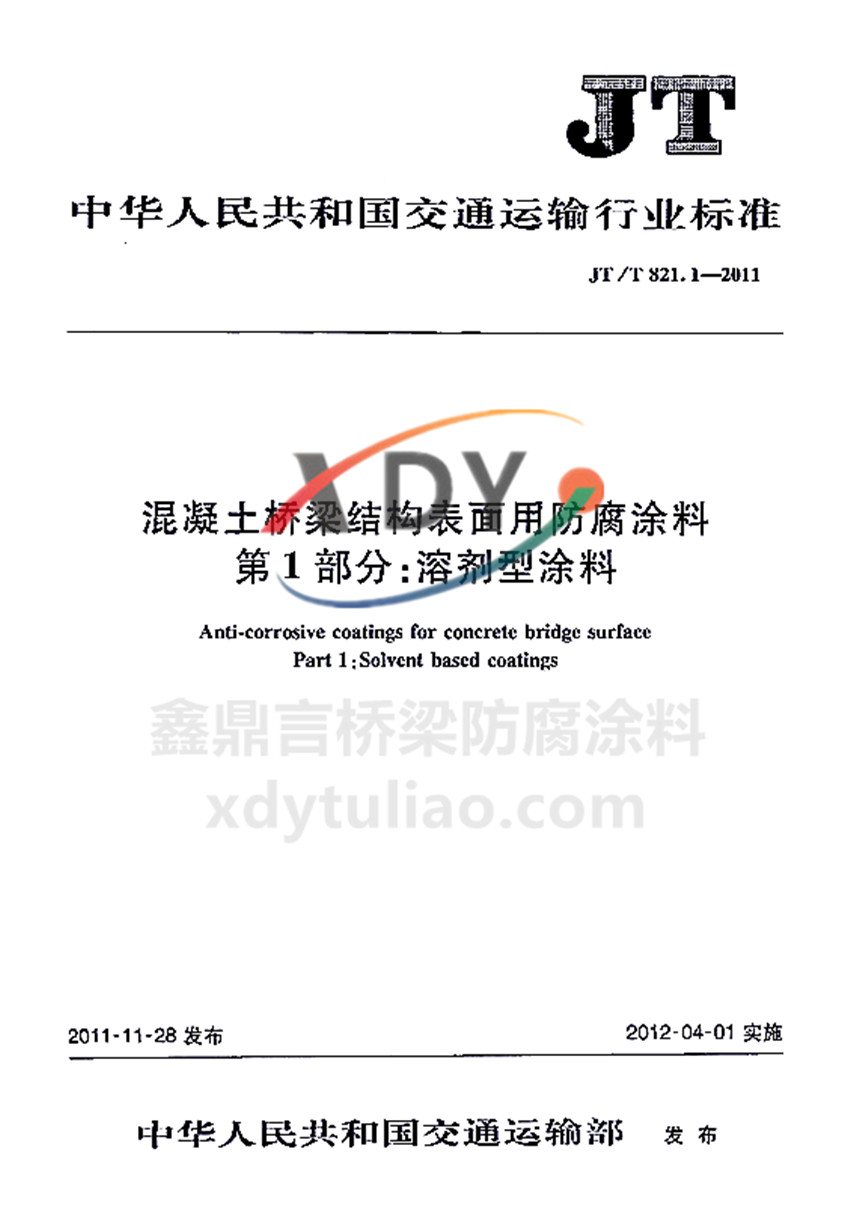 混凝土橋梁結(jié)構(gòu)表面用防腐涂料 第1部分:溶劑型涂料JT/T821.1-2011 中華人民共和國(guó)交通運(yùn)輸行業(yè)標(biāo)準(zhǔn) JT/T821.1-2011 混凝土橋梁結(jié)構(gòu)表面用防腐涂料 第1部分:溶劑型涂料 Anti-corrosive coatings for concrete bridge surface Part 1:Solvent based coatings 2011-11-28發(fā)布 2012-04-